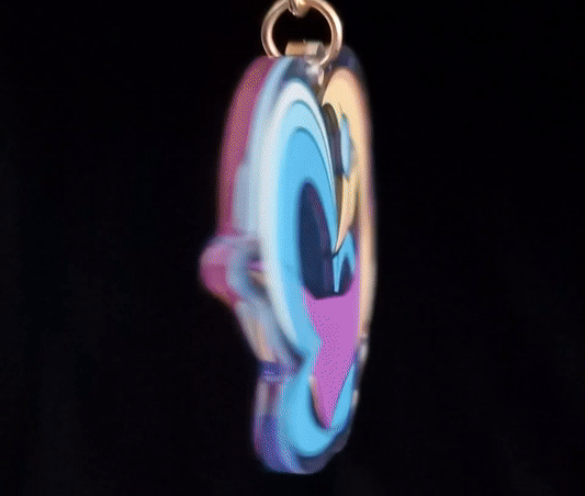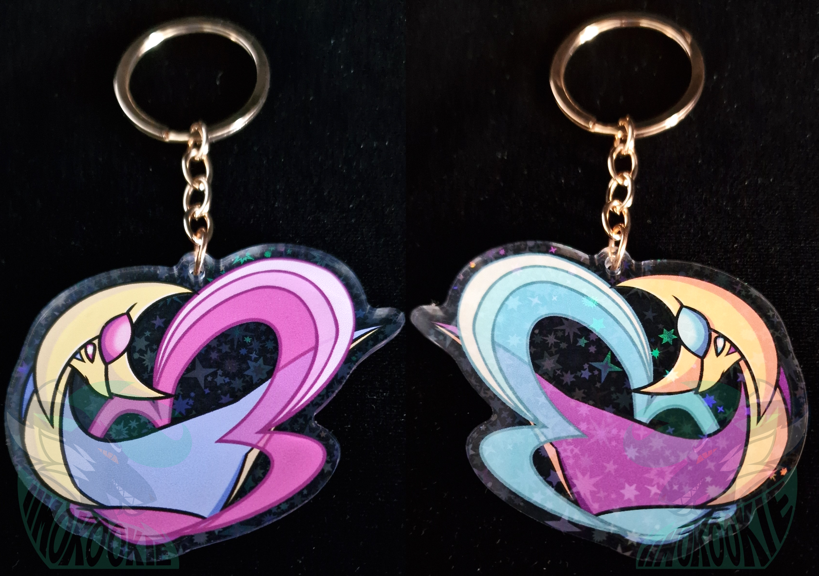 They have both the regular coloring and shiny coloring on each side of the keychain that you get & the stars are mostly on the shiny version's side~