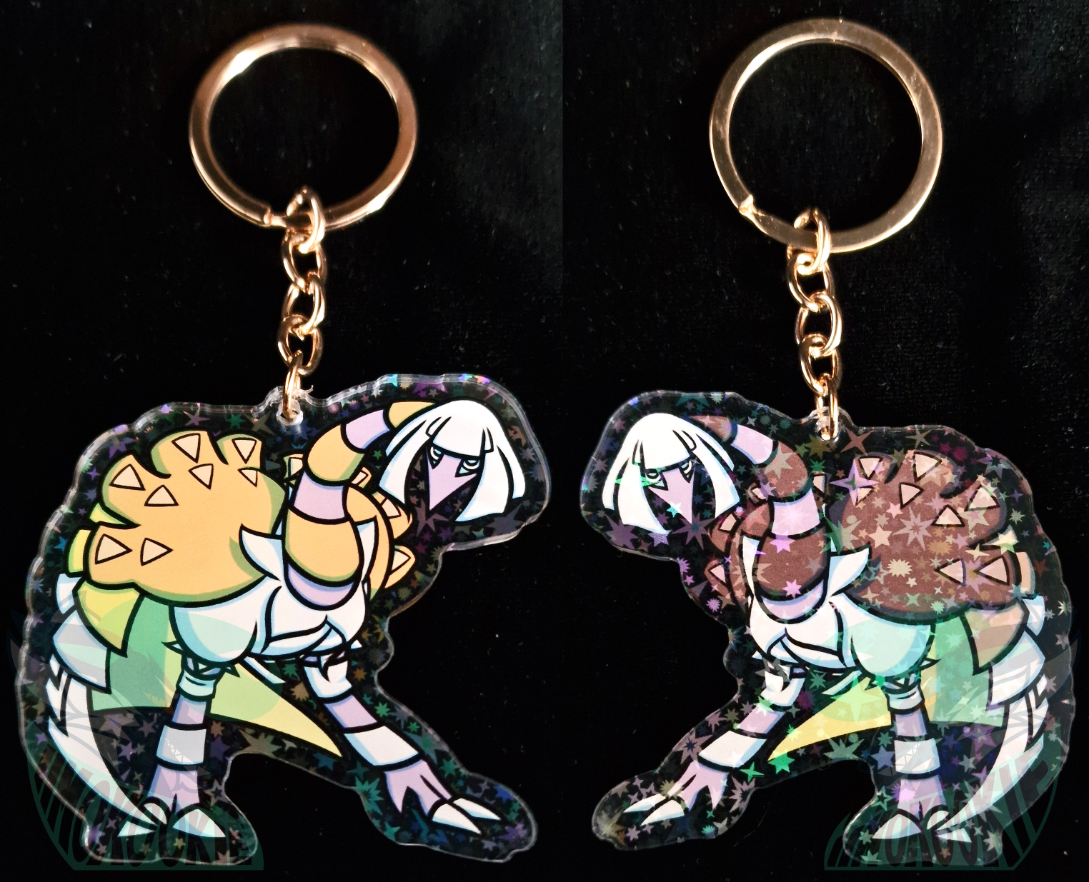 They have both the regular coloring and shiny coloring on each side of the keychain that you get & the stars are mostly on the shiny version's side~