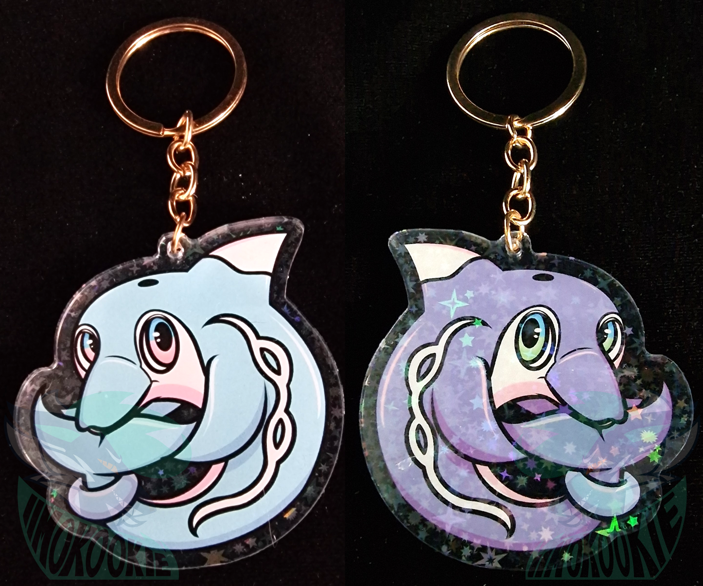 They have both the regular coloring and shiny coloring on each side of the keychain that you get & the stars are mostly on the shiny version's side~