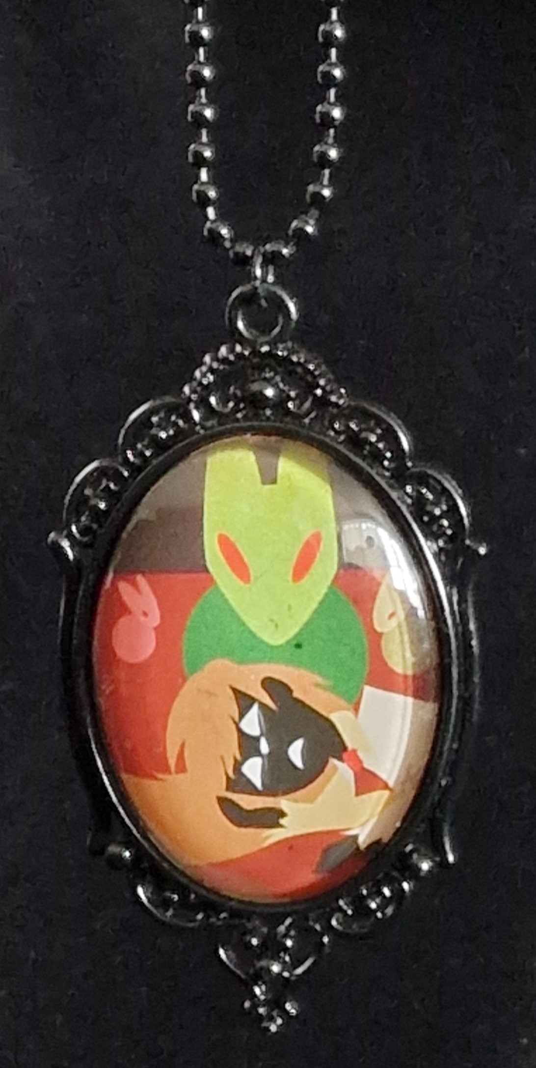A Cabochon necklace with art of Ib lost with the rabbits inside, based off of some of the game's endings~